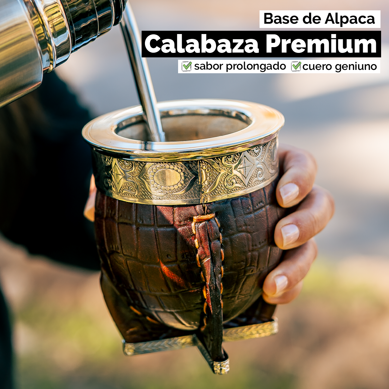 🧉 Mate Imperial de Calabaza, con fleje/guarda y virola lisa, íntegramente en alpaca, forrados en cuero labrado con motivo "piel de yacare" de primera calidad.